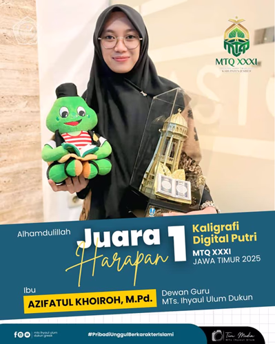 Keberhasilan luar biasa diraih oleh Bu Atul, salah satu guru di MTs Ihyaul Ulum Dukun, yang berhasil meraih Juara Harapan 1 dalam lomba Kaligrafi Digital Putri pada ajang MTQ XXXI Jawa Timur 2025. Dalam kompetisi yang digelar di Kota Jember, Bu Atul mewakili kontingen Gresik dan memberikan kontribusi besar bagi prestasi timnya.