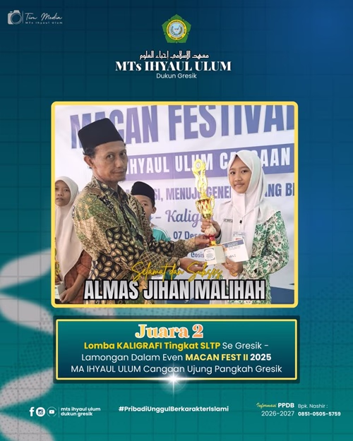 Sementara itu, di cabang Lomba Kaligrafi, siswi berbakat lainnya, Al Mas Jihan Malihah, berhasil meraih Juara 2. Karya kaligrafinya dinilai unggul dari segi estetika, kreativitas, dan ketelitian oleh dewan juri. Pencapaian ini menunjukkan bahwa MTs Ihyaul Ulum tidak hanya unggul dalam bidang akademik, tetapi juga kuat dalam seni dan kreativitas.