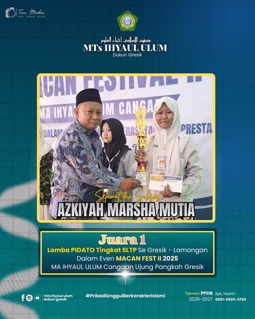Prestasi membanggakan kembali diraih oleh para siswi MTs Ihyaul Ulum Dukun Gresik dalam ajang MACAN FEST II 2025 yang diselenggarakan oleh MA Ihyaul Ulum Cangaan, Ujung Pangkah, Gresik. Dalam kompetisi tingkat SLTP se-Gresik dan Lamongan tersebut, dua siswi berhasil membawa pulang piala kejuaraan dari dua bidang lomba berbeda.